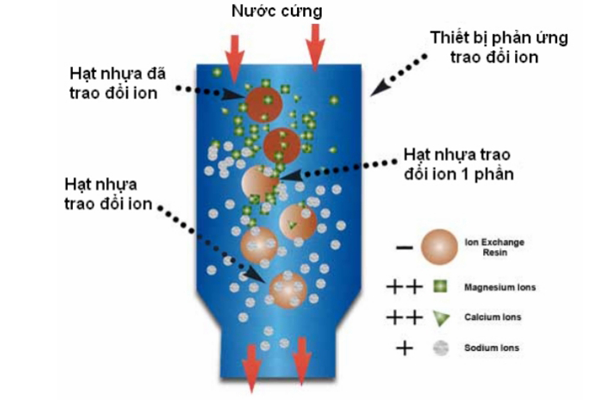 Đây là phương pháp đầu tiên được nhiều người biết đến. Nó sử dụng một loạt hạt nhựa không hòa tan. Chứa các ion trao đổi Canxi, Magie trong dung dịch phản ứng. Điều này giúp nước cứng chuyển đổi thành nước mềm.